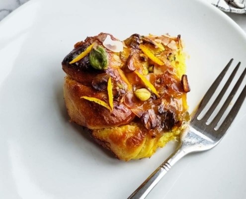 - Kwast de overgebleven jam over de broodjes en bestrooi met overige sinaasappelrasp, pistachenoten en amandelschaafsel