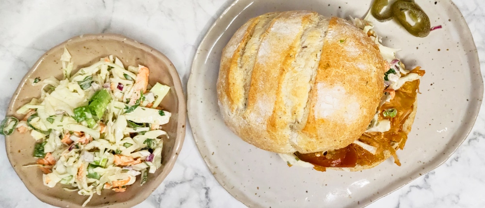 Mijn recept voor broodjes pulled jackfruit met coleslaw is: