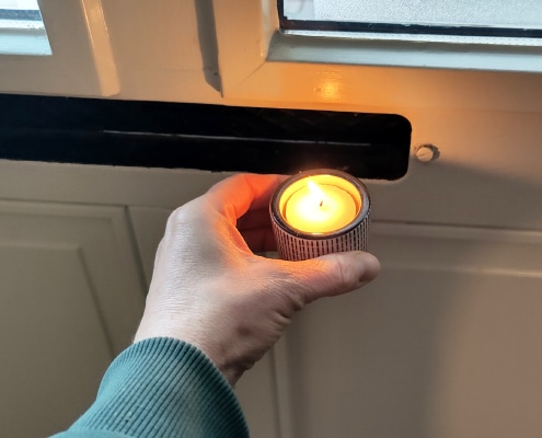 Tocht kan op allerlei plekken in huis ontstaan. De ramen en deuren zijn vaak de grootste boosdoeners, maar ook kieren bij vloeren, plinten en ventilatieopeningen kunnen zorgen voor ongewenste koude luchtstromen. Loop eens een rondje door je huis om deze plekken op te sporen. Een eenvoudige manier om te checken waar het tocht, is door een brandende kaars of aansteker langs de naden van ramen en deuren te houden; wiebelt de vlam, dan is er luchtlek.