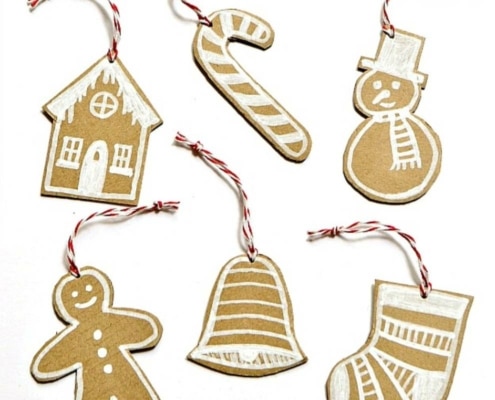 Gemberkoek mannetjes en huisjes zijn een Amerikaanse traditie, maar je ziet ze ook steeds vaker in Nederland. Natuurlijk kun je koekjes in je boom hangen, maar deze kartonnen figuurtjes van HelloLittleHome zullen jaren meegaan. Knip ze uit volgens de mal, teken de lijnen erop en hang ze in je kerstboom. Een eenvoudig en goedkope kerstversiering van gerecycled materiaal, die je kerstboom opfleurt.