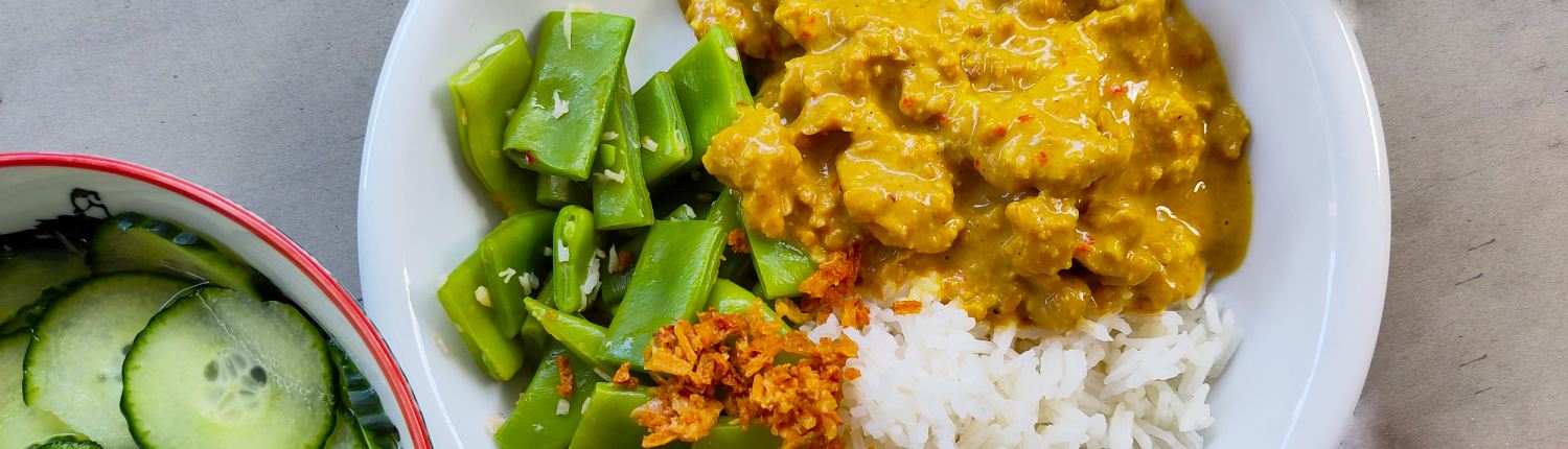Rendang is een stoofgerecht afkomstig uit de Indonesische keuken. Traditioneel wordt het gemaakt met rundvlees, maar in deze vegetarische rendang gebruiken we seitan als alternatief. Door de kokosmelk, citroengras, laos en andere Indonesische specerijen krijgt het gerecht die authentieke, diepe smaak. Serveer het met geurige pandanrijst en eventueel wat knapperige (snij)boontjes of komkommer voor een frisse bite.